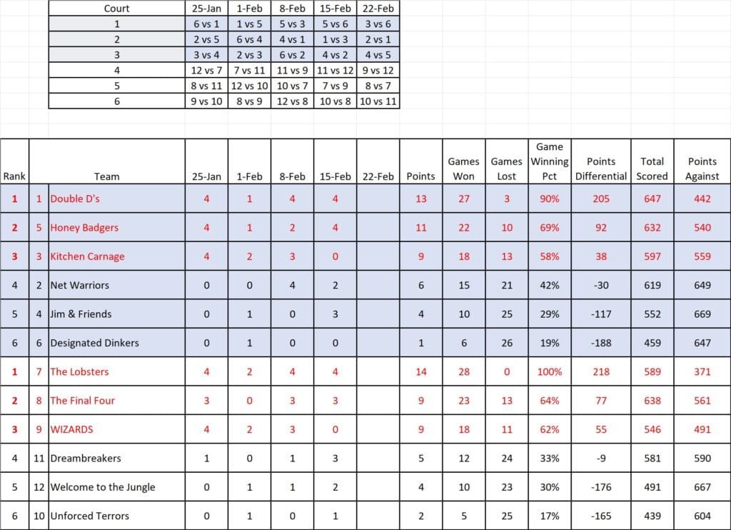 The contest between Jim & Friends v the Net Warriors saw the most competitive play of the day with three of their matches going to 3 games and ending the regular play 2-2, forcing one of two Dreambreakers played today. In the Dreambreaker, Beth Dicomitis and Maureen Plainfield of Jim & Friends earned their pay for the day, outscoring their counterparts from the Warriors, 12-5 to win the Dreambreaker. Still, the Warriors held on to their #4 spot this week. If the Warriors want to make it into the Champions bracket for the playoffs, they have to beat #1 Double D’s combined with Kitchen Carnage going down against the Dinkers.